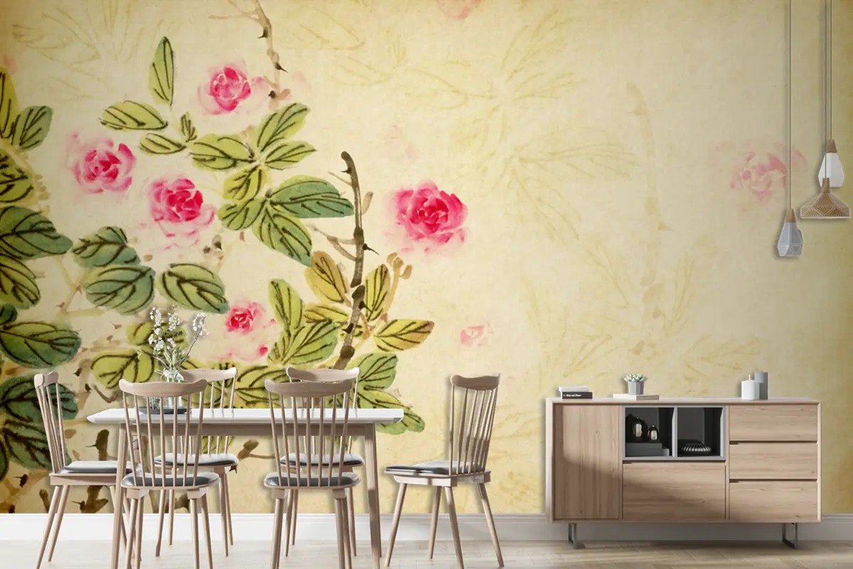 Eski Kağıt Duvar Kağıdı Duvar Üzerine Gül Çiçeğinin Geleneksel Çin Resmi