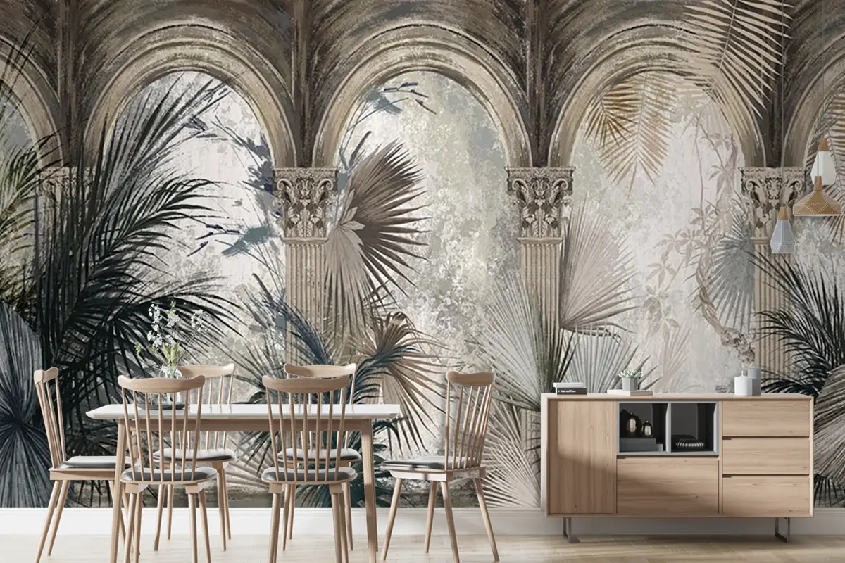 Eskitme Sütunlar Duvar Kağıdı , Tropikal Yapraklar Duvar Kağıdı