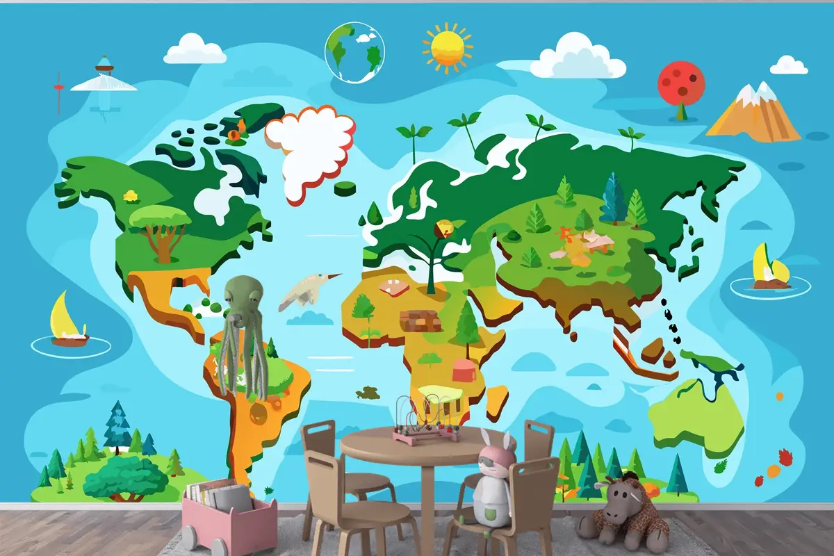 Farklı Ağaç Türleriyle Dünya Haritası İnteraktif Dünya Haritası Çocuk Odası Duvar Kağıdı
