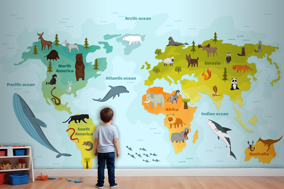 Farklı Hayvan Çocuk Odası Duvar Kağıdı Ile Dünya Haritası