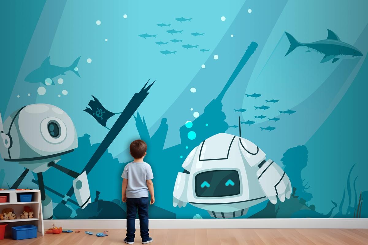 Fütüristik Robotlar Deniz Kompozisyonu Çocuk Odası Duvar Kağıdı