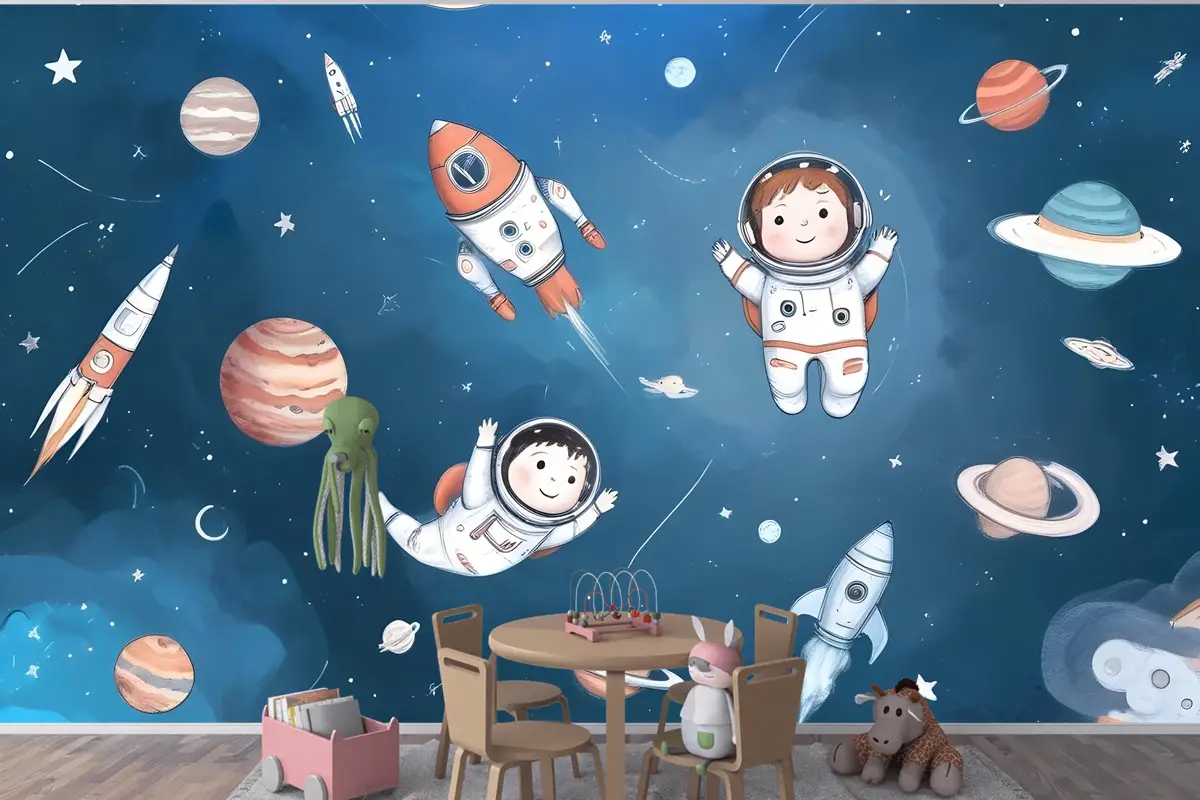 Gezegenler Çocuk Odası Duvar Kağıdı Ile Çocuklar Suluboya Uzay
