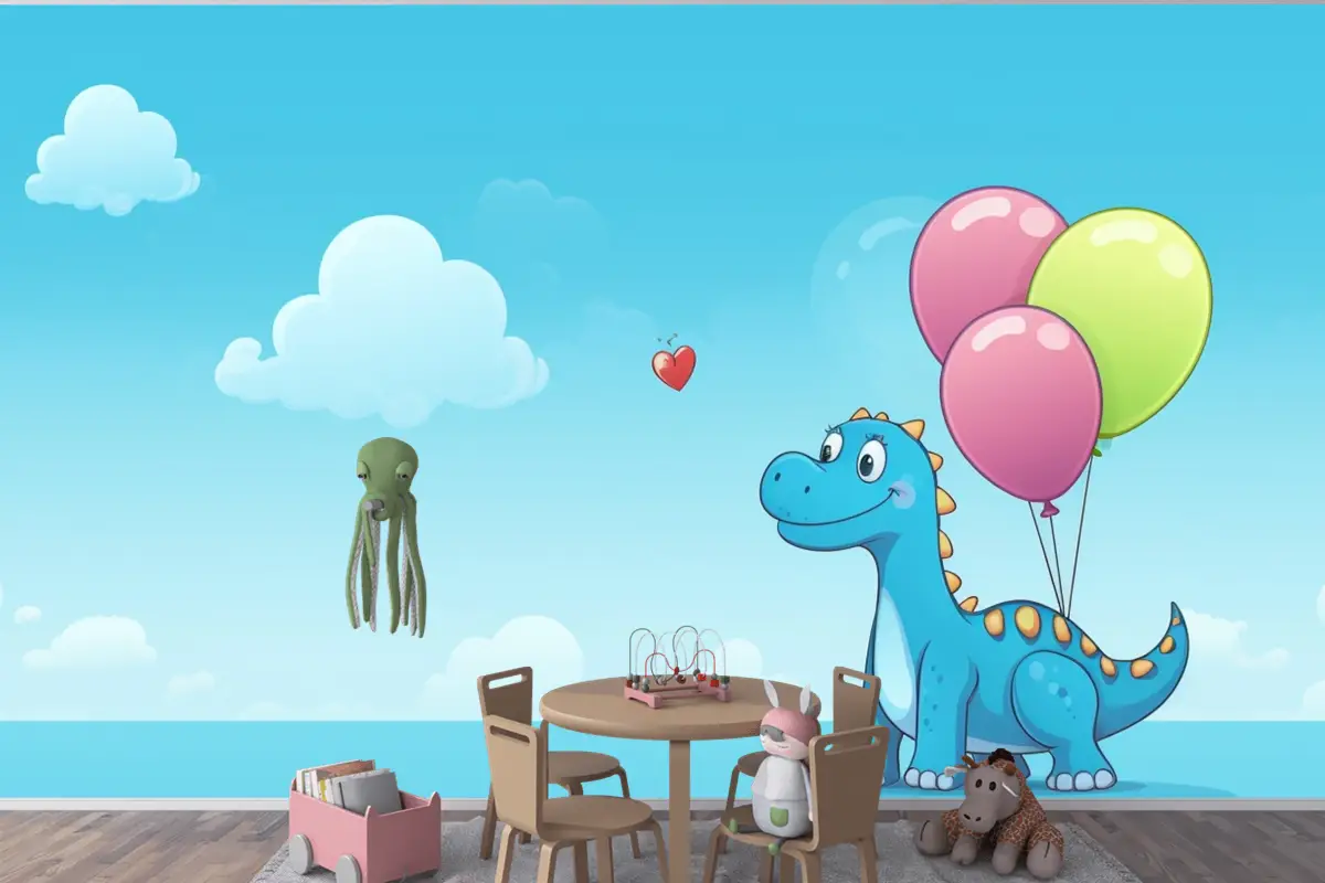 Gökyüzünde Balonları Olan Bir Ejderha Ve Çocuk Odası Duvar Kağıdı Nde Bir Kalp