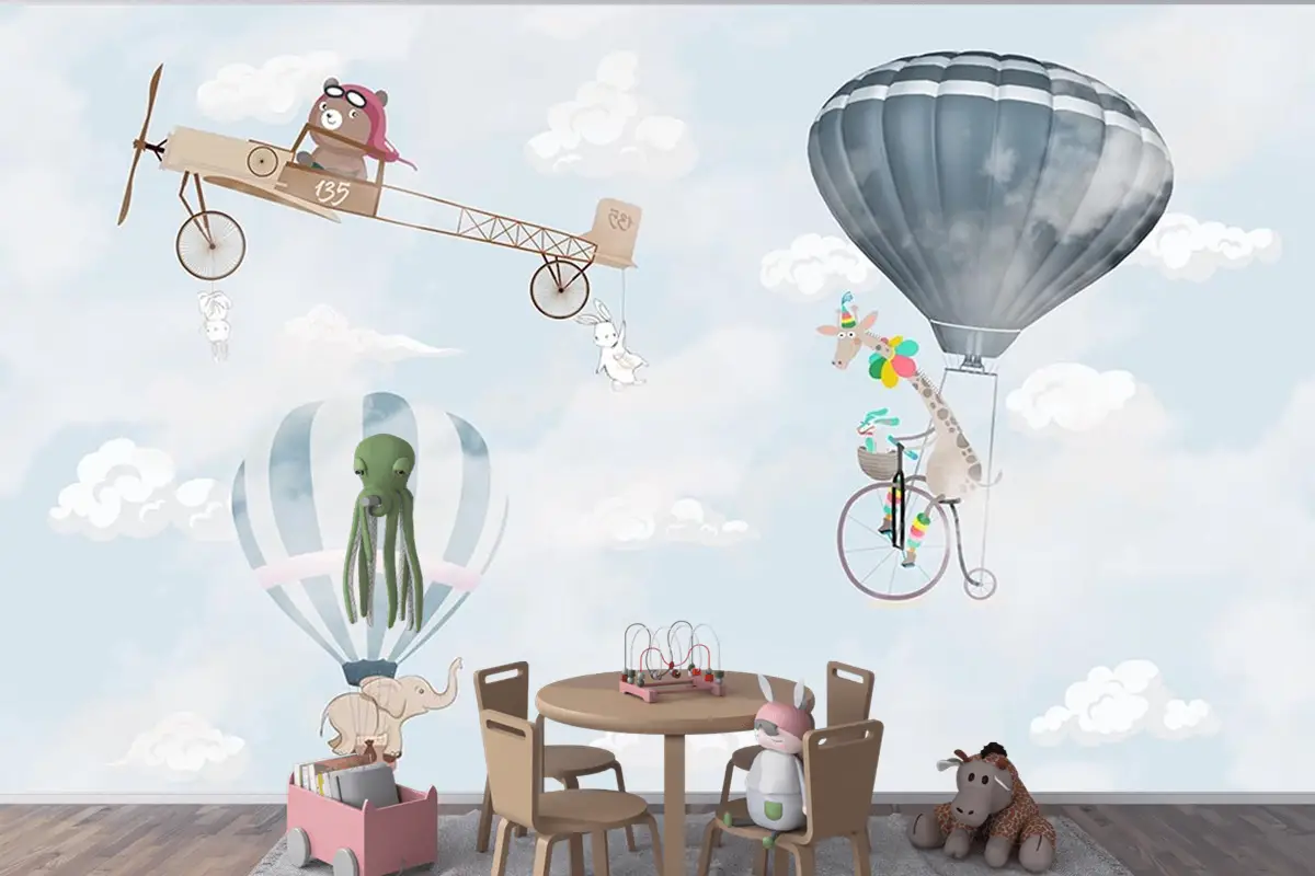 Gökyüzünde Uçak Balonlar Ve Sevimli Hayvanlar Çocuk Odası Duvar Kağıdı