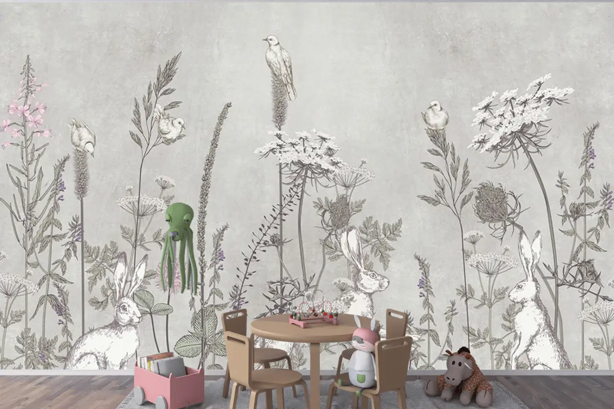 Gri Tavşanlar Ve Çiçekler Çocuk Odası Duvar Kağıdı