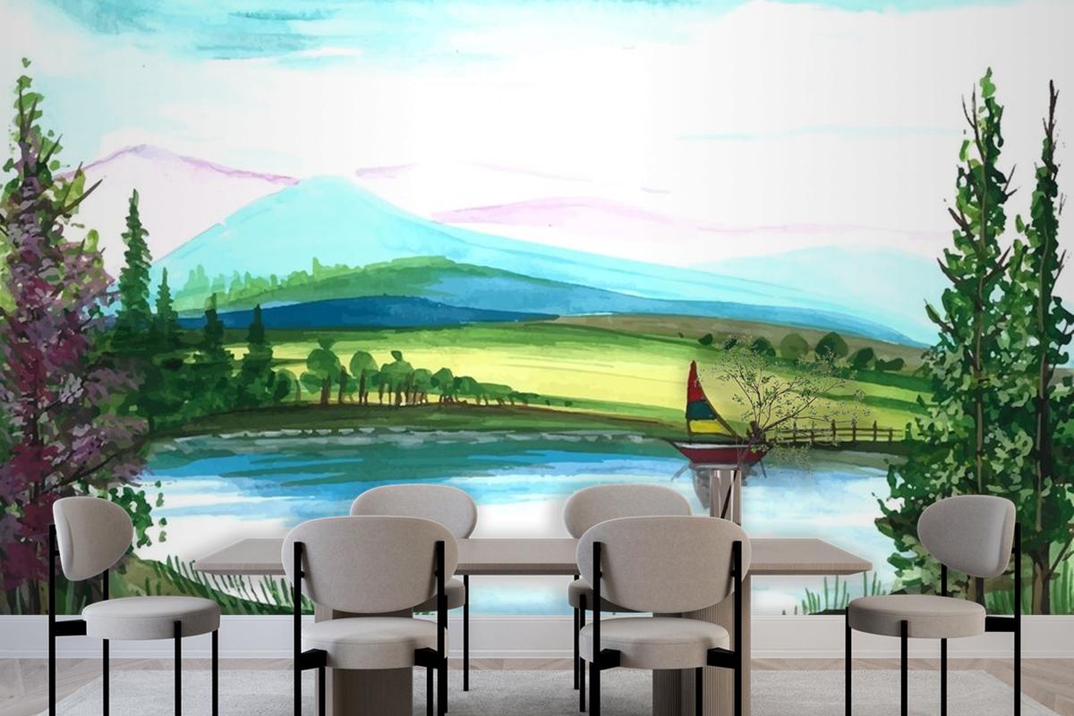 Güzel Doğa Manzarası El Çizimi Suluboya Yemek Odası Duvar Kağıdı
