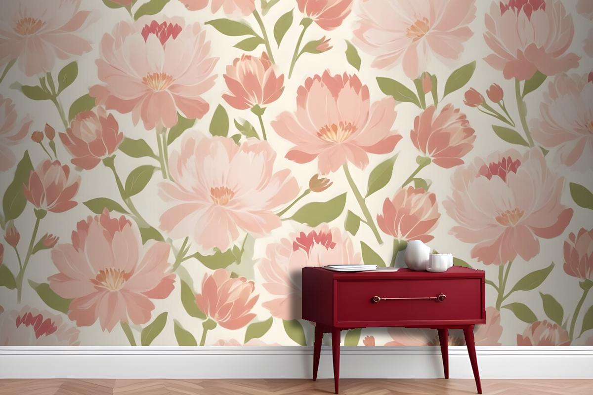 Hafif Antre Hol Koridor Duvar Kağıdı Duvarında Yeşil Yapraklı Pembe Ve Şeftali Çiçekleri