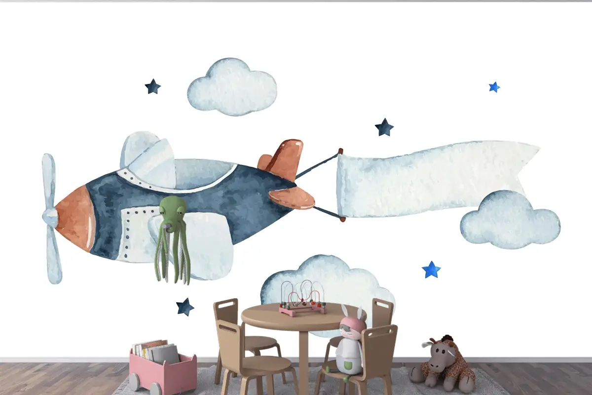 Hava Uçağı Bulutları Ve Yıldızlarla Sevimli Suluboya Gökyüzü Sahnesi Çocuk Odası Duvar Kağıdı