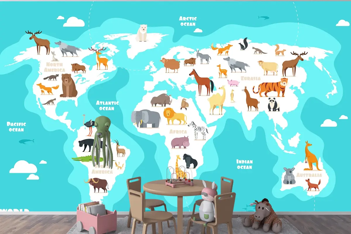 Hayvanlarla Dünya Haritası Dünya Keşfi Komik Çocuklar Coğrafya Çocuk Odası Duvar Kağıdı