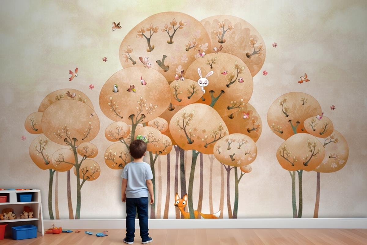 Hayvanlı Suluboya Orman Sonbahar Tilki Çocuk Odası Duvar Kağıdı
