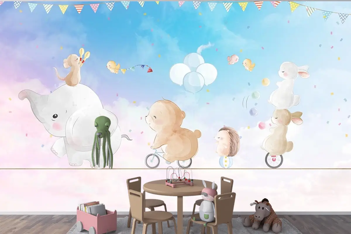 İp Üstünde Mutlu Hayvanlar Çocuk Odası Duvar Kağıdı