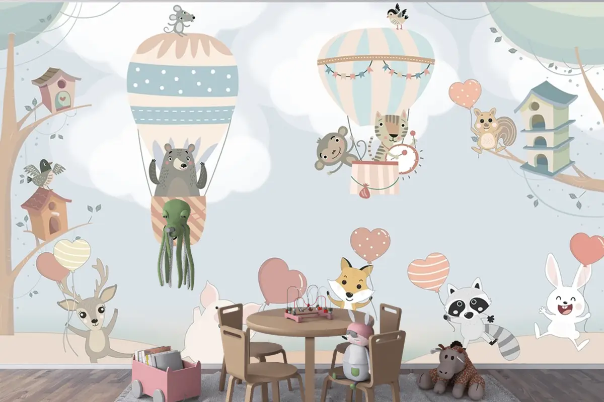 İskandinav Hayvanları Sıcak Hava Balonları Çocuk Odası Duvar Kağıdı