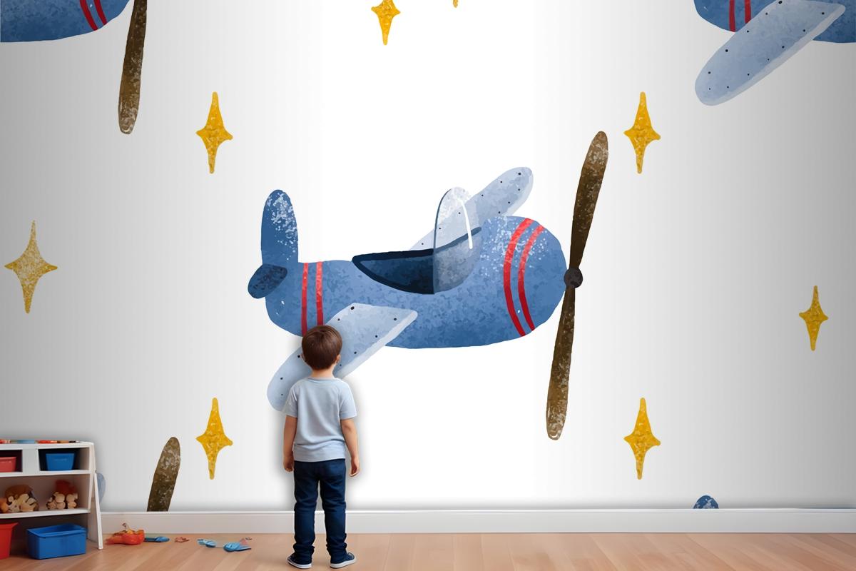 İskandinav Tarzında Uçak Ve Bulutlar Çocuk Odası Duvar Kağıdı