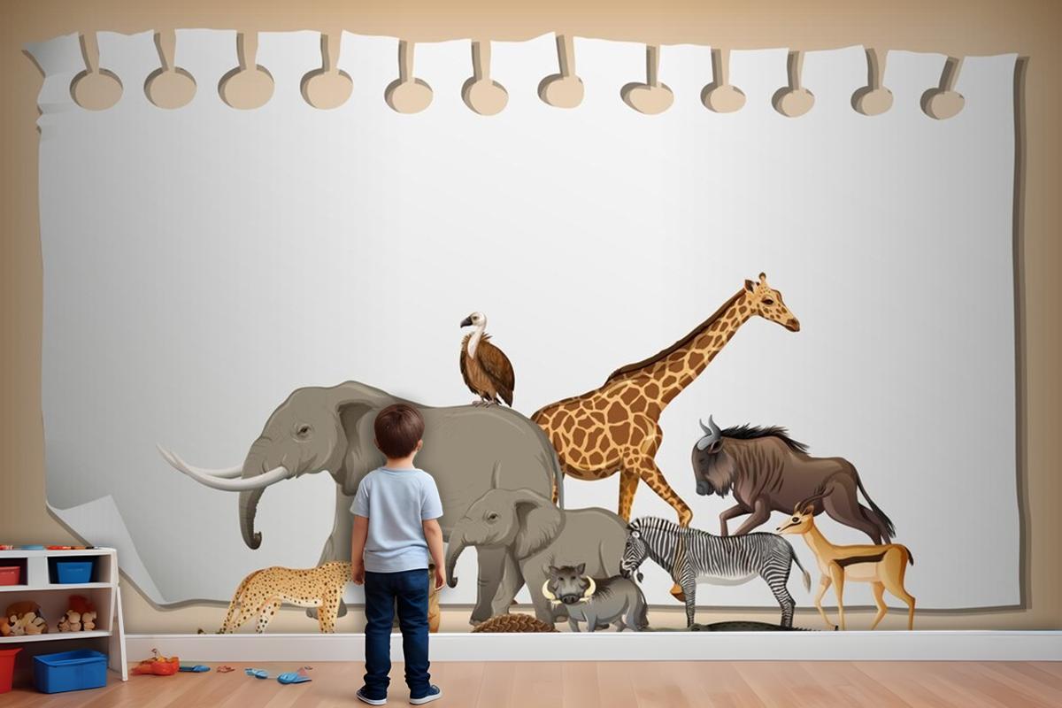 Kağıt Çocuk Odası Duvar Kağıdı Üzerinde Vahşi Afrika Hayvanı Grubu