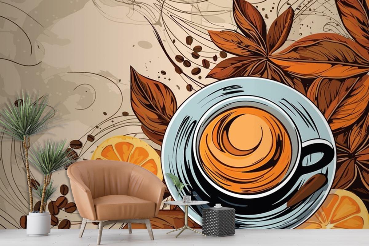 Kahve Anasonlu Yıldızlar Portakal Ve Yapraklı Soyut Çizim Cafe Duvar Kağıdı