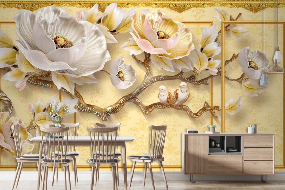Kalıplı Klasik Iç Duvar 3D Çiçek Ve Kuşlar Duvar Kağıdı