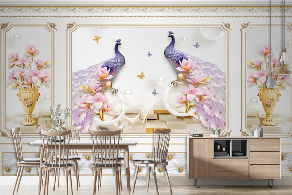 Kalıplı Klasik Iç Duvar Kuğu Ve Saksakıda Çiçekli 3D Duvar Kağıdı