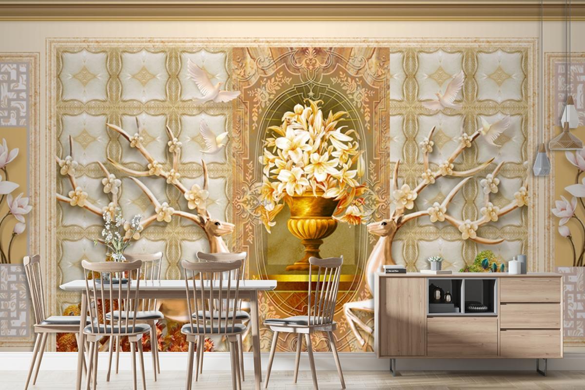 Kalıplı Klasik Iç Duvar Ortada Saksı Ve Geyikler 3D Duvar Kağıdı