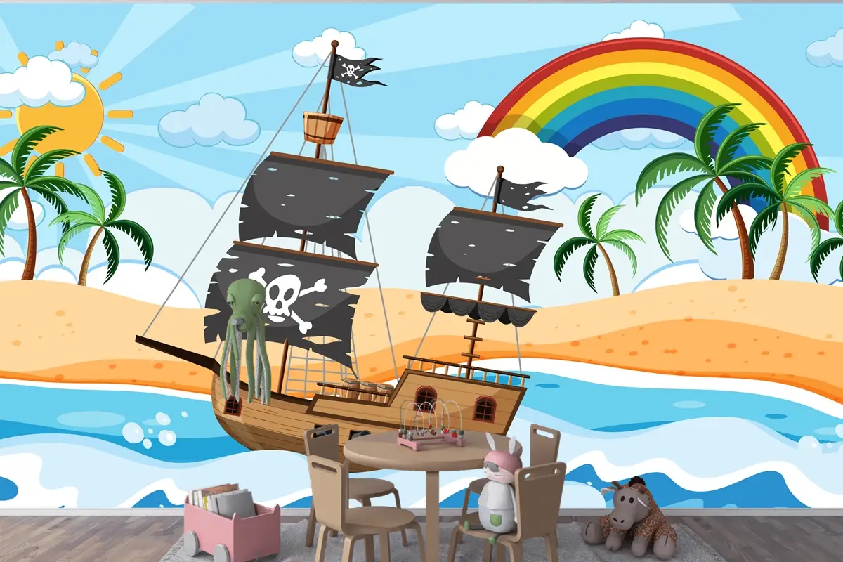 Karikatür Tarzı Çocuk Odası Duvar Kağıdı Duvarında Gündüz Sahnesinde Korsan Gemisi Ile Okyanus
