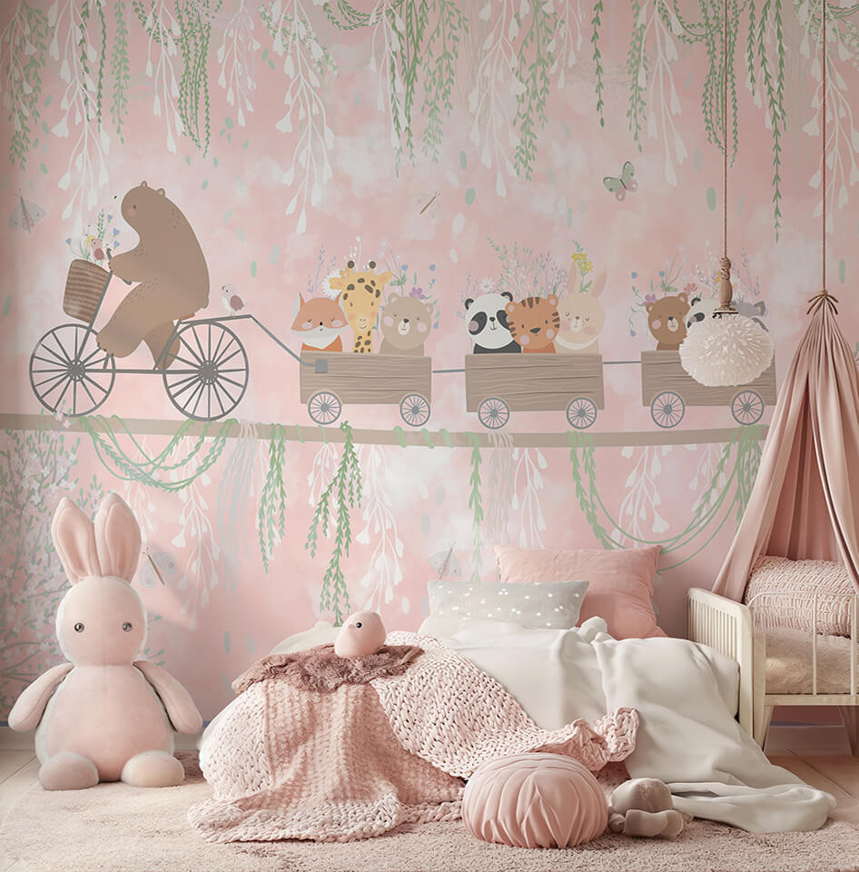 Kendinden Yapışkanlı - Çiçekli Vagonlar Serüveni Pembe Düşler Yolculuğu Bisikletli Ayı Çocuk Odası Duvar Kağıdı