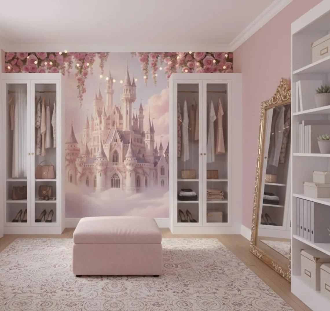 Kendinden Yapışkanlı - Masal Şatosu Pembe Bulutlar Çocuk & Bebek Genç Kız Odası Duvar Kağıdı