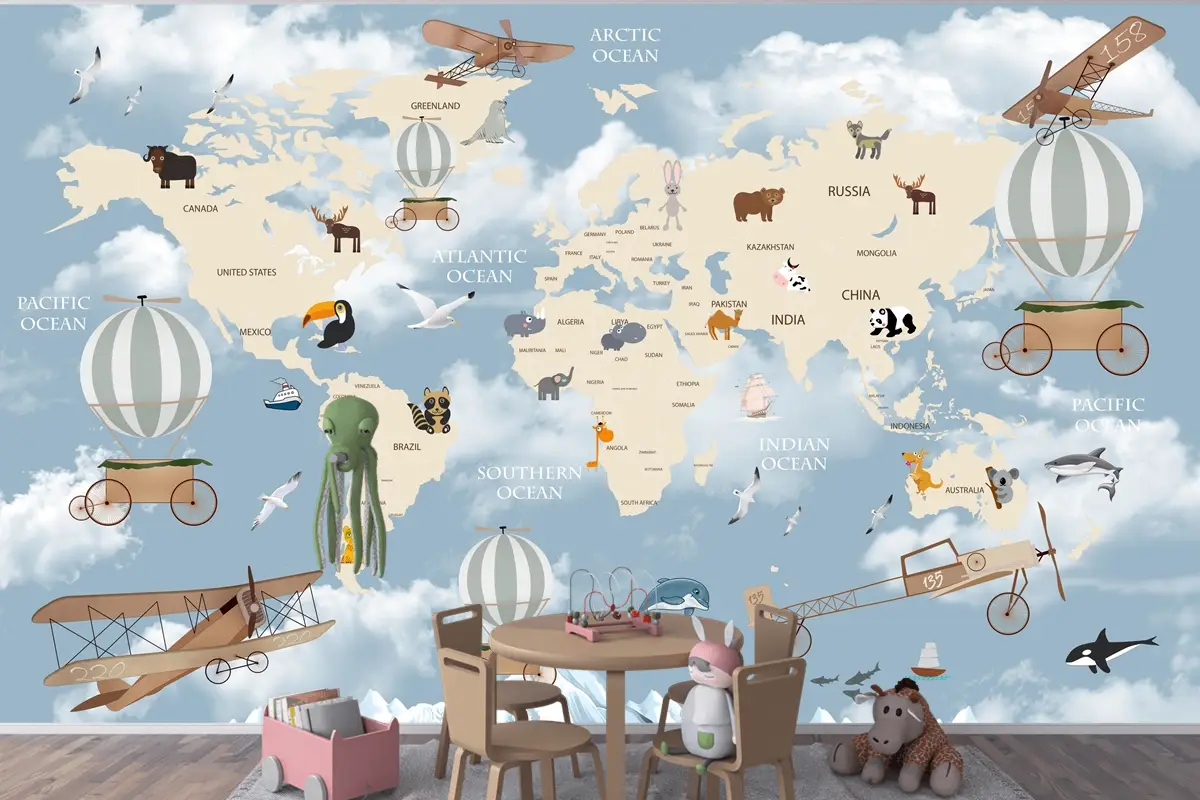 Keşif ve Oyun Temalı Harita Desenli Çocuk Odası Duvar Kağıdı