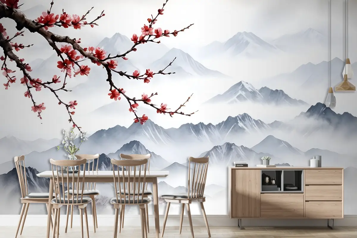 Kiraz Çiçeği Duvar Kağıdı Ile Karlı Dağ Manzarası