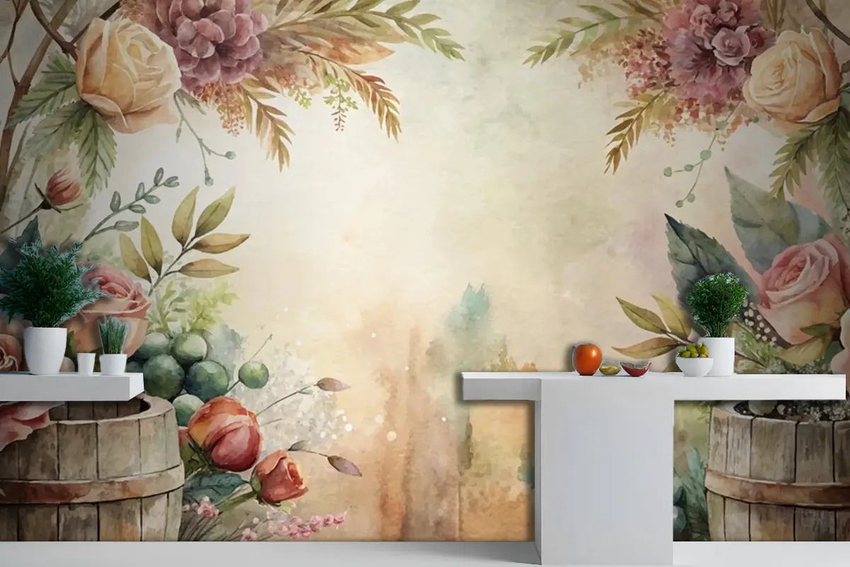 Kırsal Çiçek Aranjmanı İçeren Suluboya Arka Plan Mutfak Duvar Kağıdı