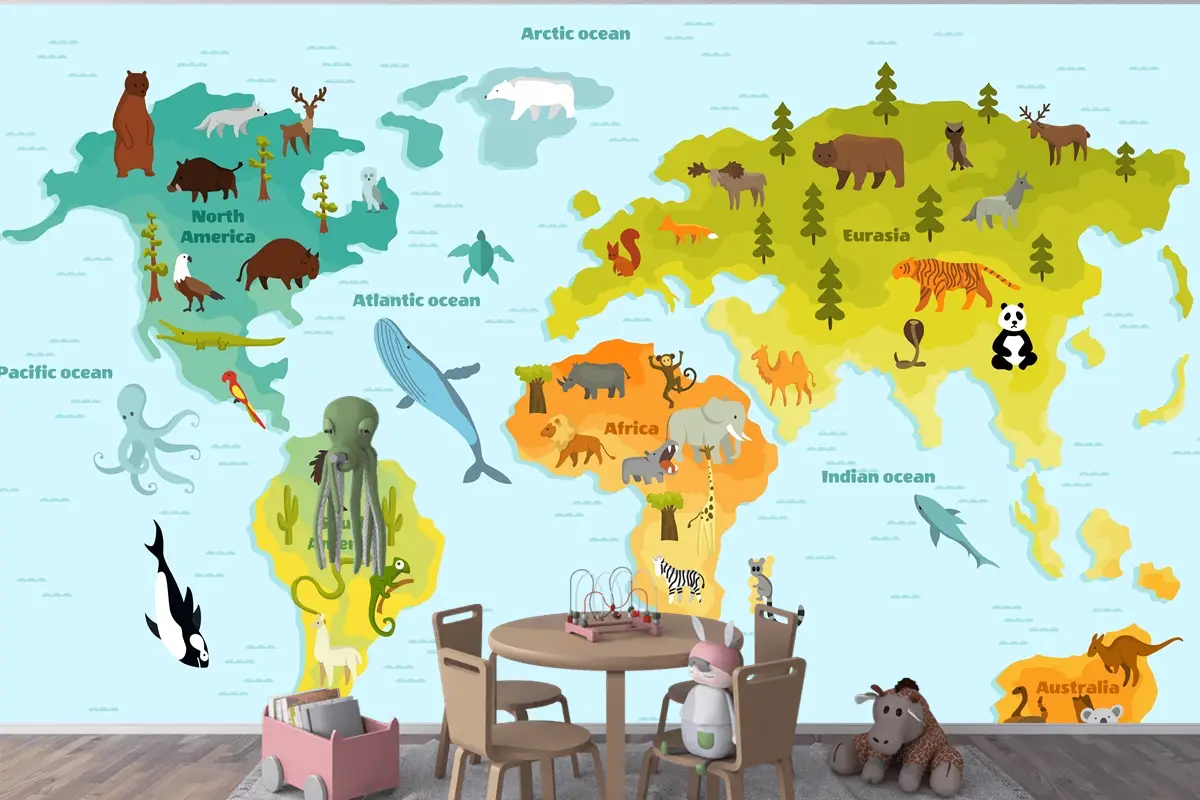 Kıtalar Çocuk Odası Duvar Kağıdı Olan Çocuklar İçin Komik Karikatür Hayvan Dünya Haritası