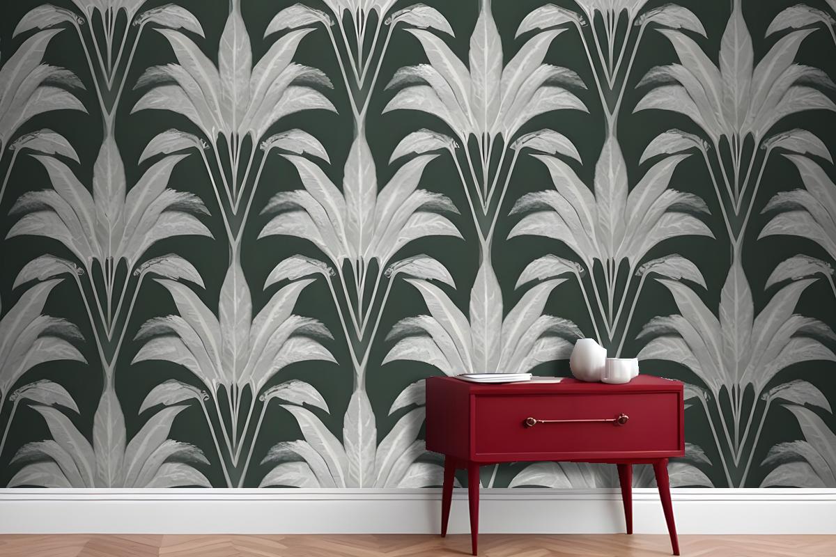 Koyu Yeşil Antre Hol Koridor Duvar Kağıdı Duvarına Karşı Gri Ve Beyaz Tonlarında Yaprak Benzeri Şekillerin Tekrarlanan Deseni