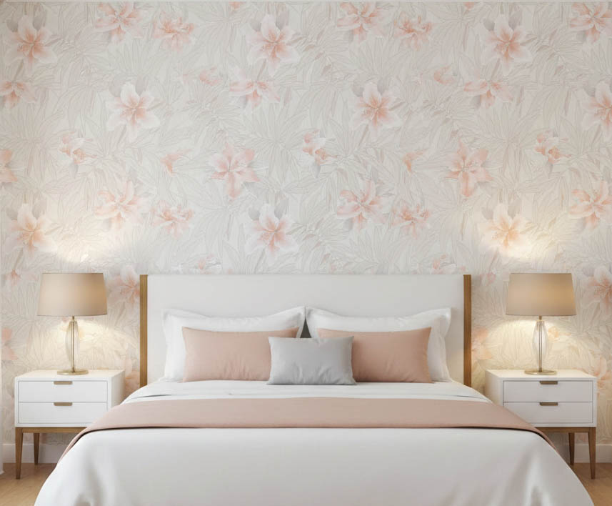 Krem Yapraklı Toz Pembe Çiçekli Tropikal Duvar Kağıdı 669510