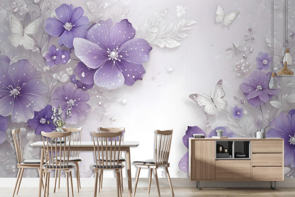 Küçük Kelebekli Mor Swarovski Çiçek Duvar Kağıdı