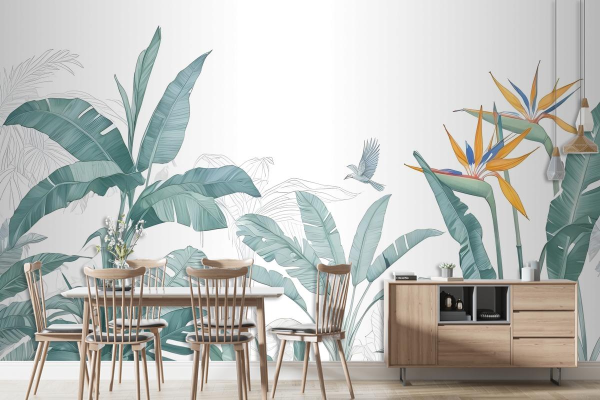 Kuşlu Tropikal Muz Yaprağı Duvar Kağıdı
