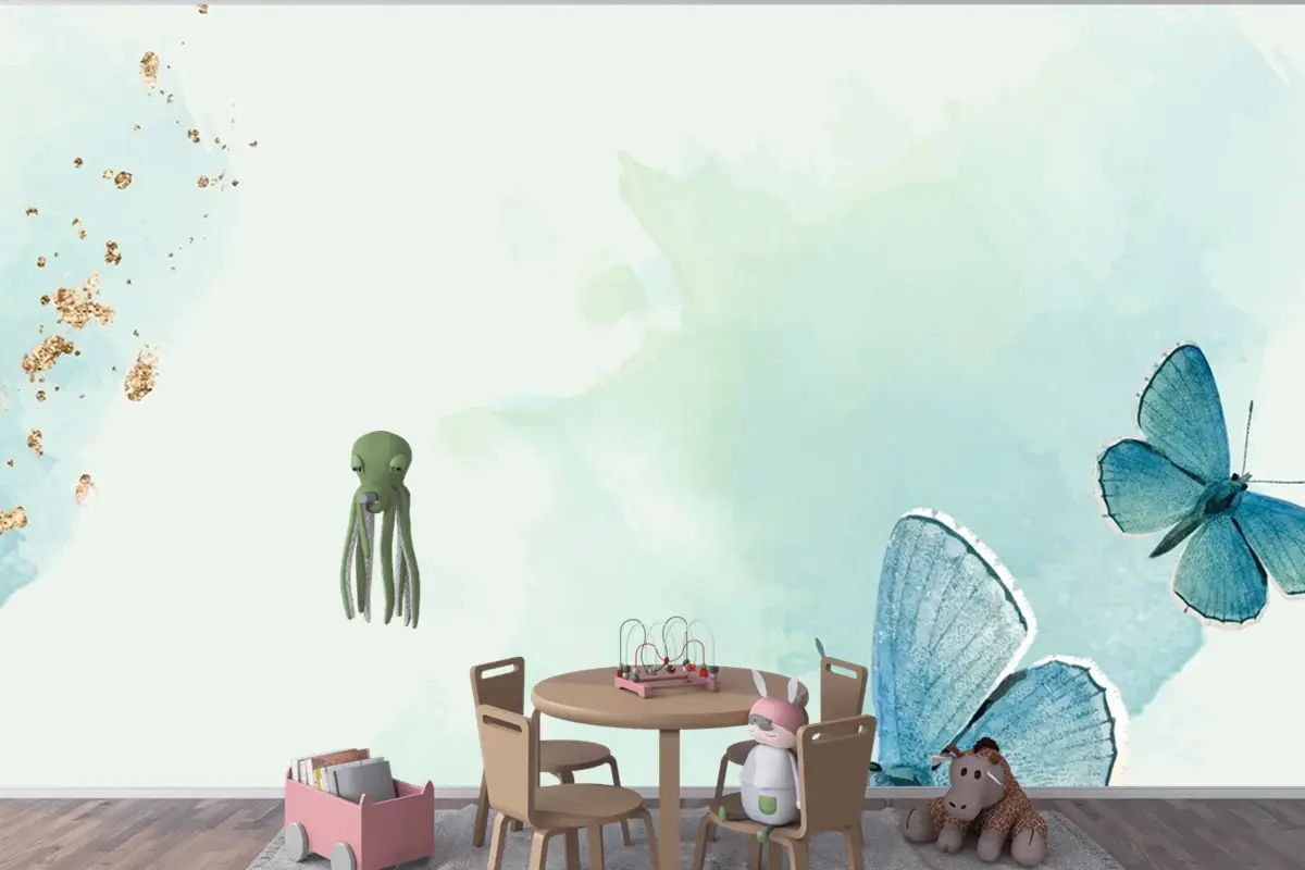 Mavi Kelebekler Desenli Arka Plan Çocuk Odası Duvar Kağıdı