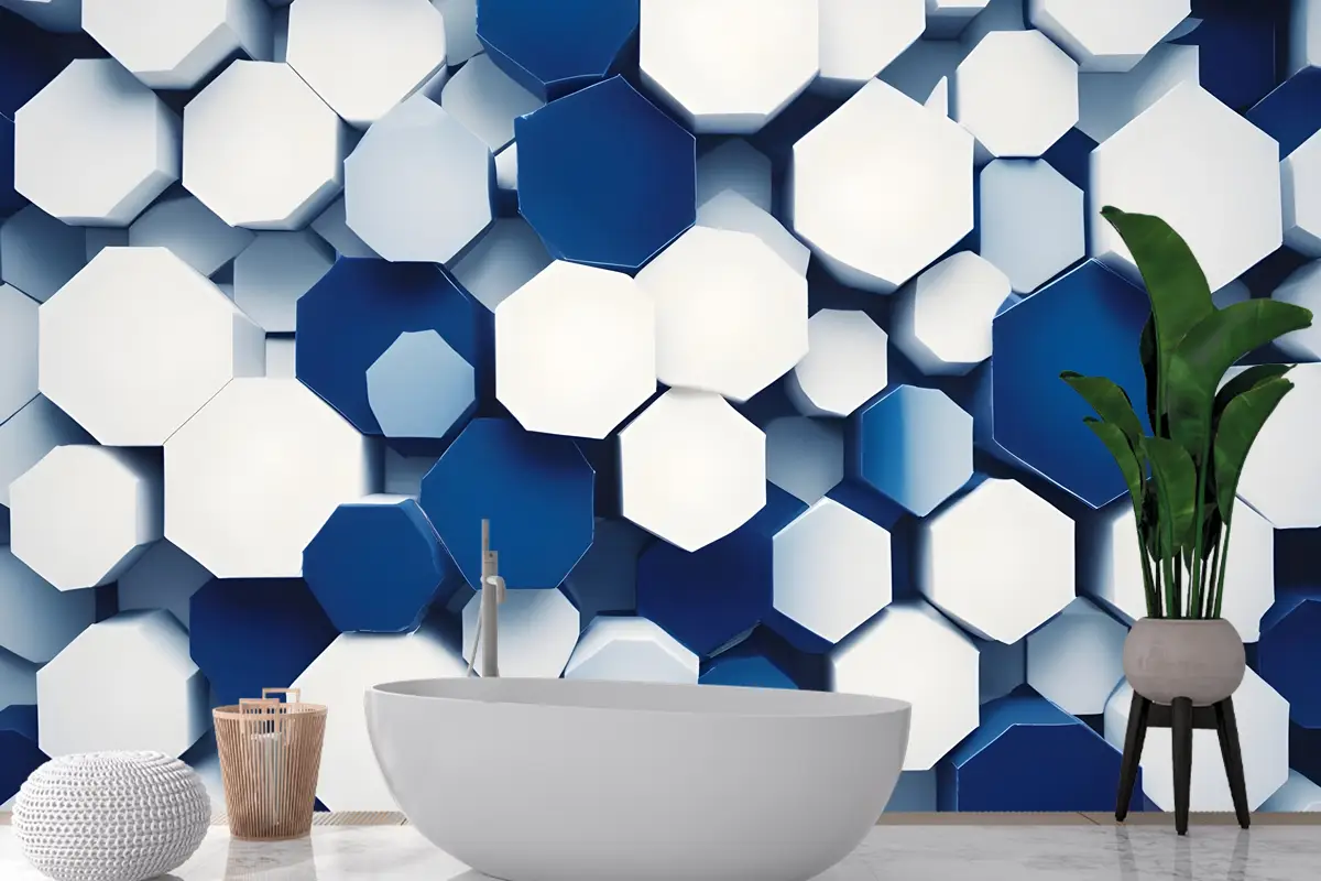 Mavi Ve Beyaz Tonlarında Üst Üste Gelen Altıgen Banyo Duvar Kağıdı