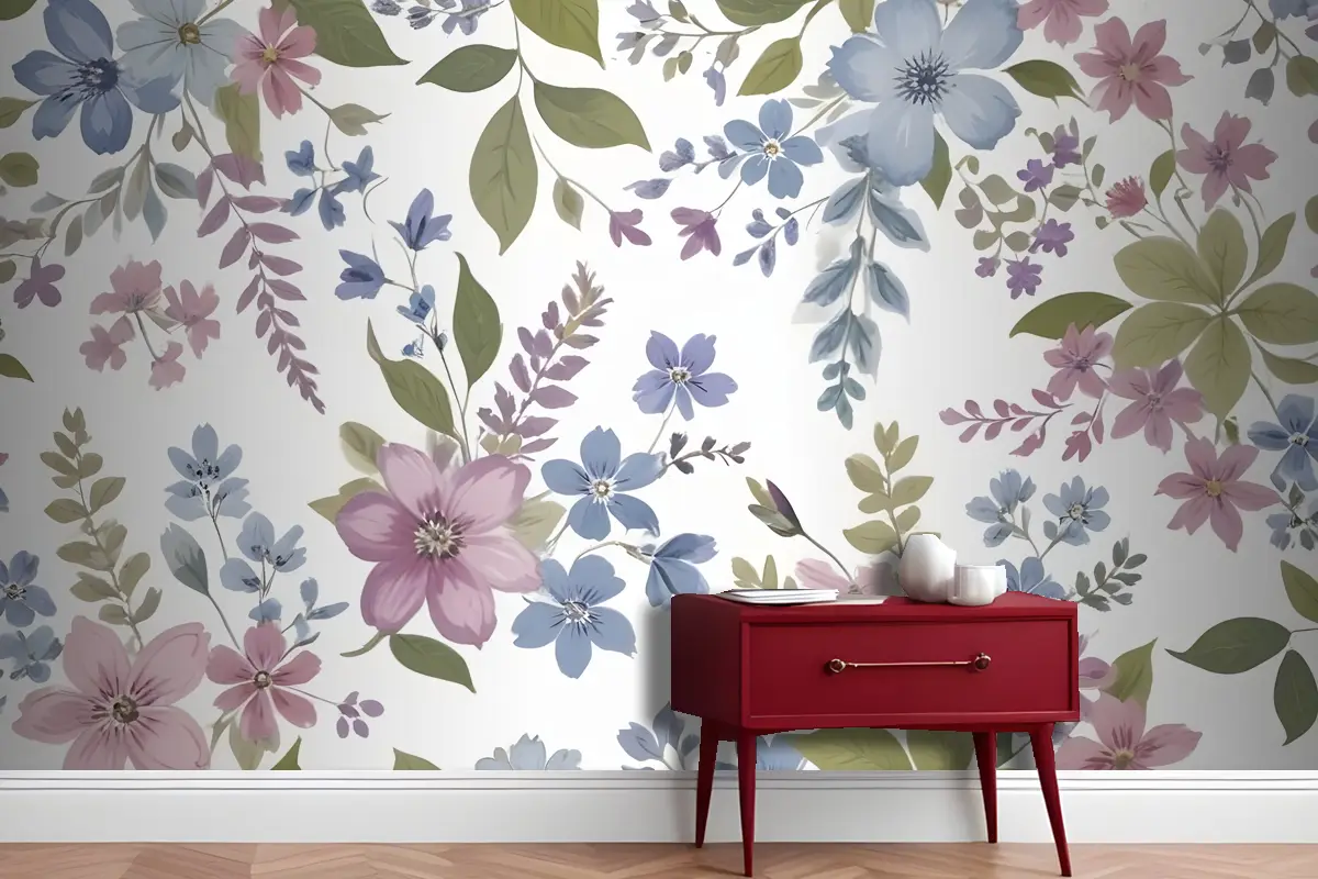 Mor Ve Mavi Suluboya Çiçek Antre Hol Koridor Duvar Kağıdı