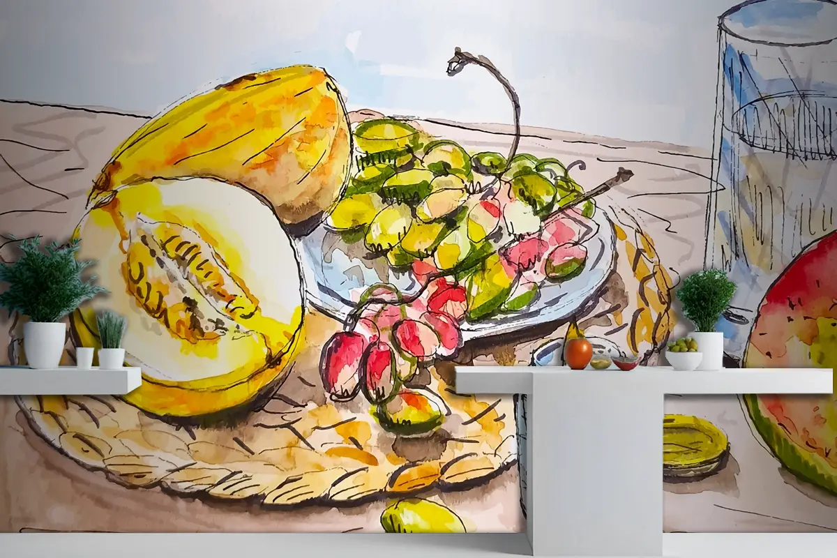 Mutfakta Masada Elle Çizilmiş Kroki Meyve Üzüm Kavun Mango Duvar Kağıdı