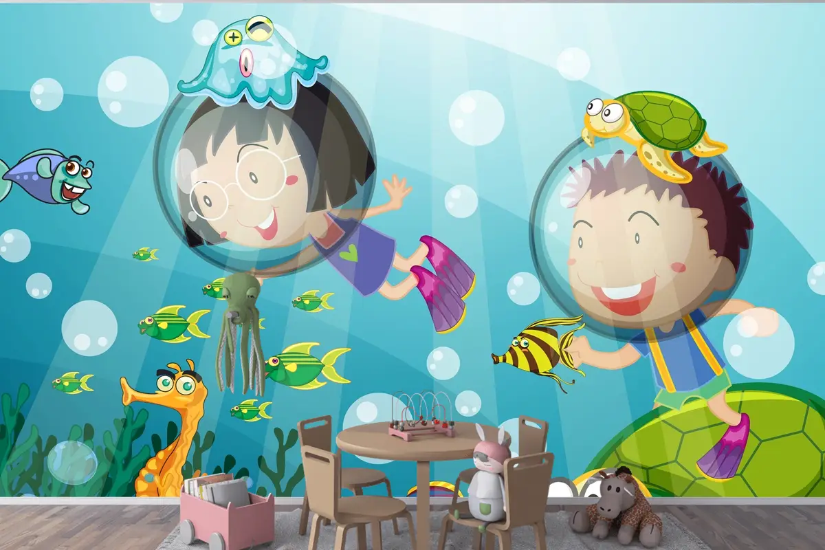 Mutlu Çocuklarla Sualtı Sahnesi Tüplü Dalış Çocuk Odası Duvar Kağıdı