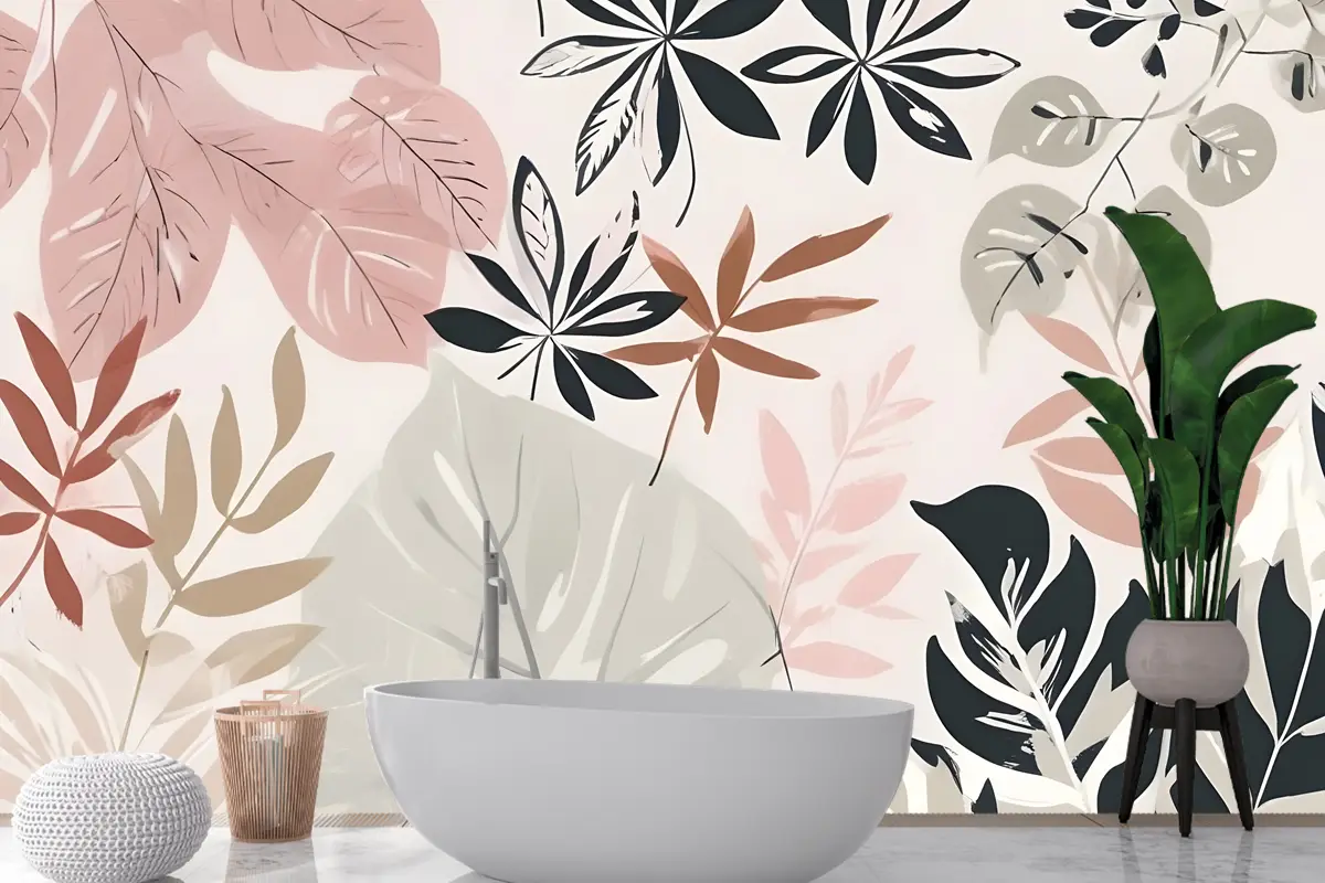 Nötr Ve Yeşil Modern Botanik Bitkiler Banyo Duvar Kağıdı