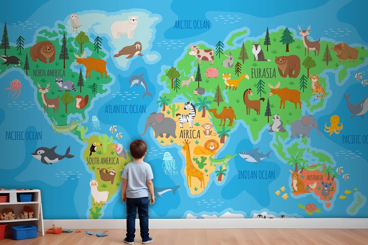 Orman Hayvanları Çocuk Odası Duvar Kağıdı Ile Çocuk Odası İçin Karikatür Dünya Haritası