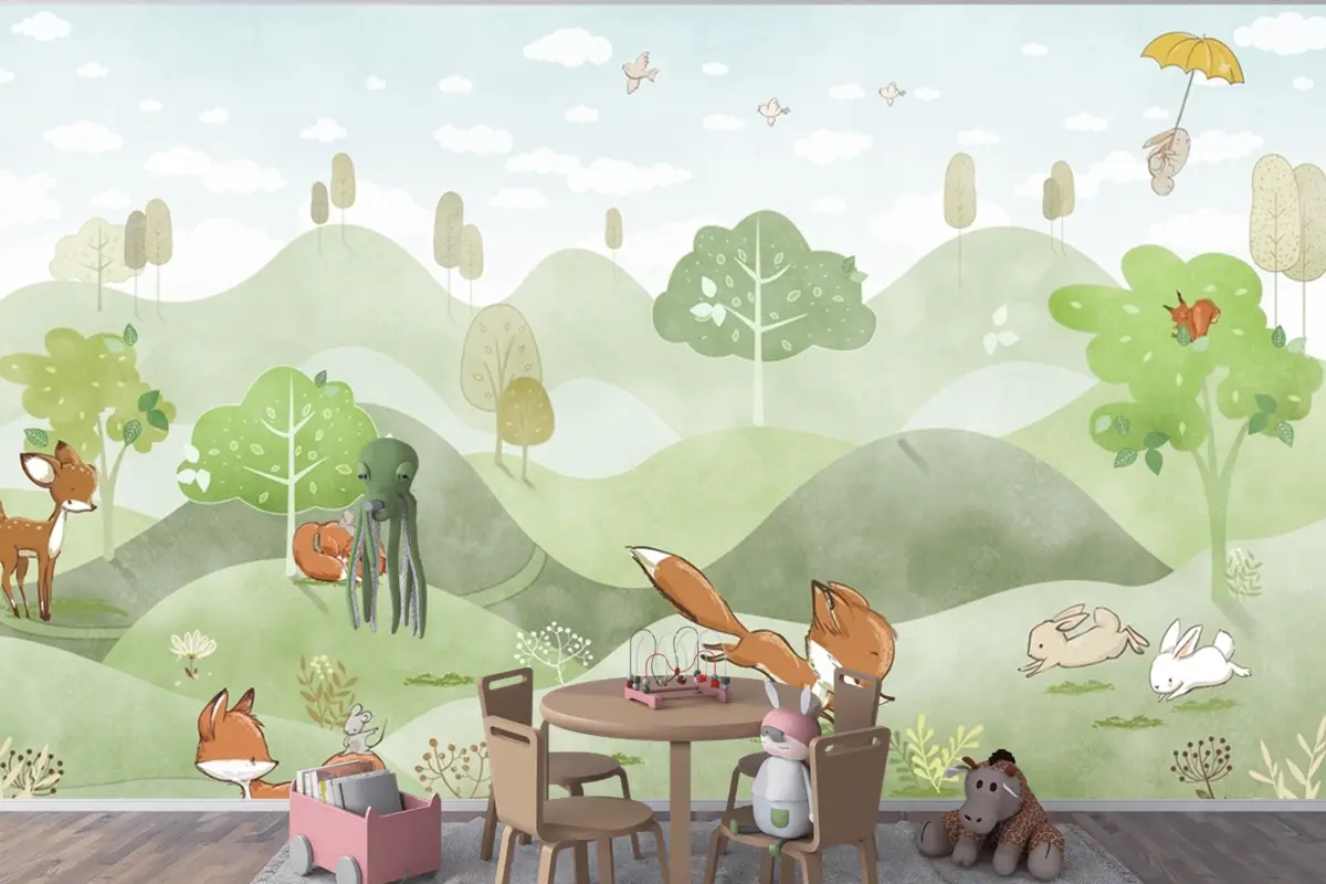 Orman Hayvanları Yeşil Orman Geyik Tilki Tavşan Bebek Odası Duvar Kağıdı