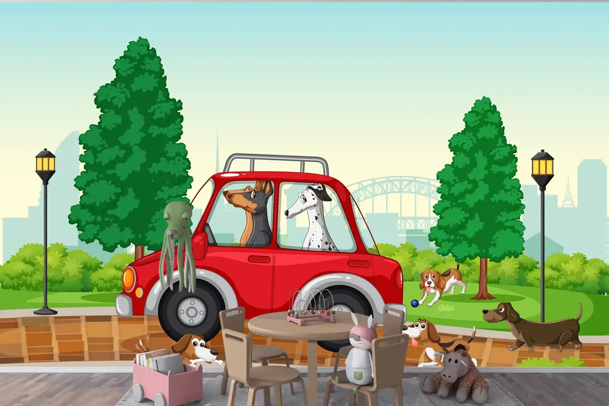 Parkta Araba Süren Ve Koşan Köpekler Çocuk Odası Duvar Kağıdı