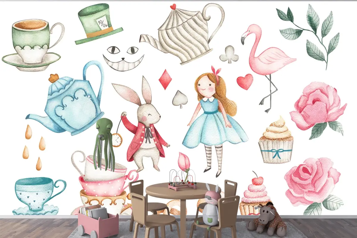 Pastel Alice Masalı ve Çay Saati Çocuk Odası Duvar Kağıdı