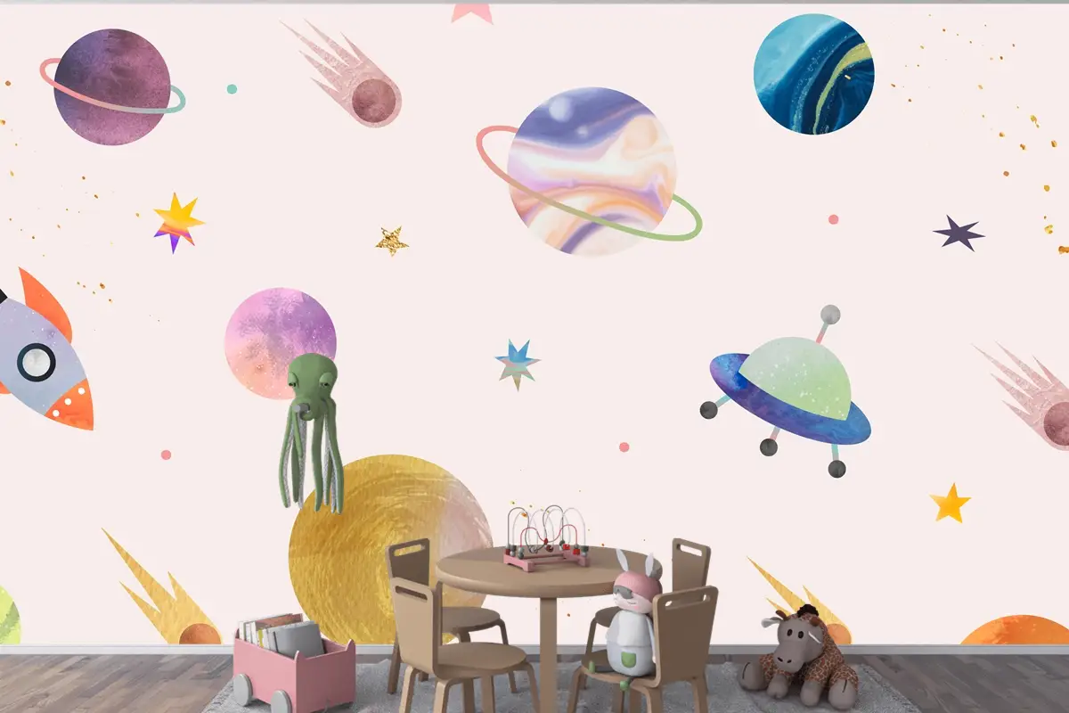 Pastel Arkaplanda Renkli Galaksi Suluboya Doodle Çocuk Odası Duvar Kağıdı