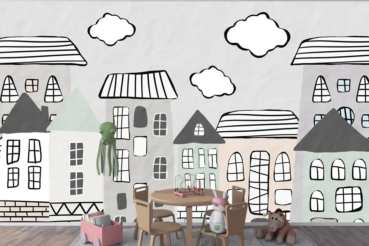 Pastel Bulutlar ve Şehir Evleri Çocuk Odası Duvar Kağıdı