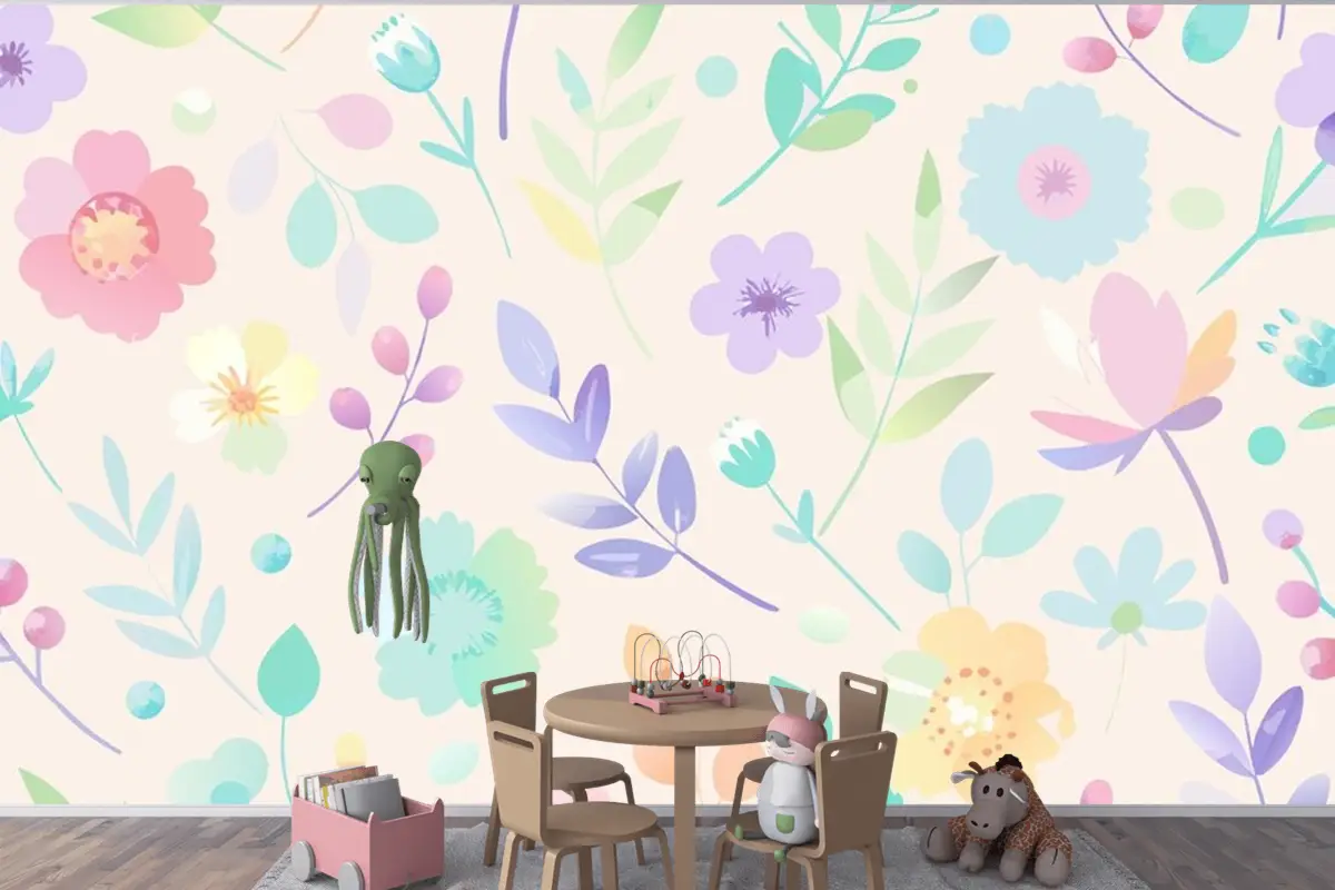 Pastel Renklerde Çiçekler Ve Yapraklarla Kusursuz Desen Çocuk Odası Duvar Kağıdı