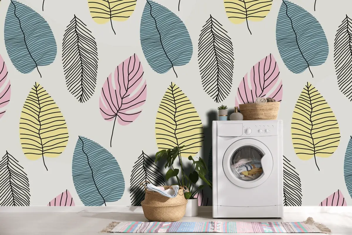 Pastel Renkli Duvar Kağıdı Ile Doğrusal Tropikal Yapraklar