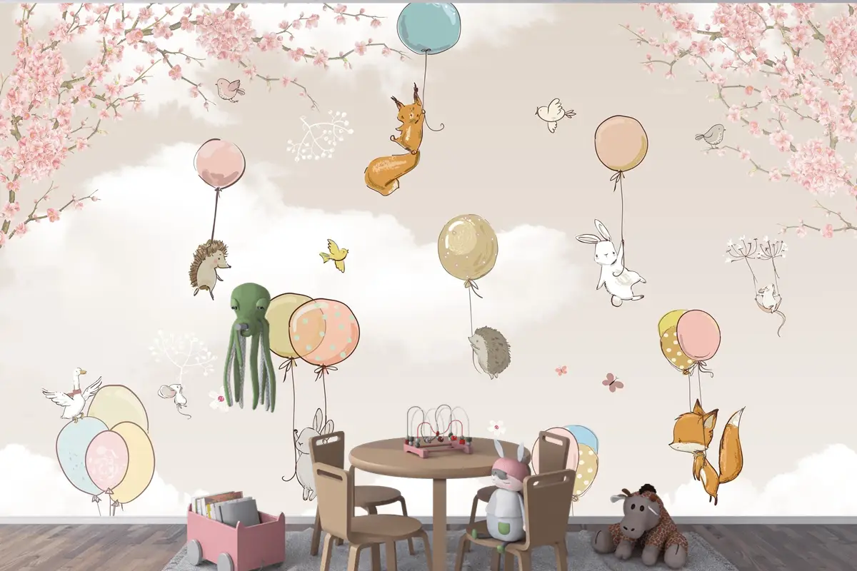 Pastel Sıcak Hava Balonları ve Orman Hayvanları Çocuk Odası Duvar Kağıdı