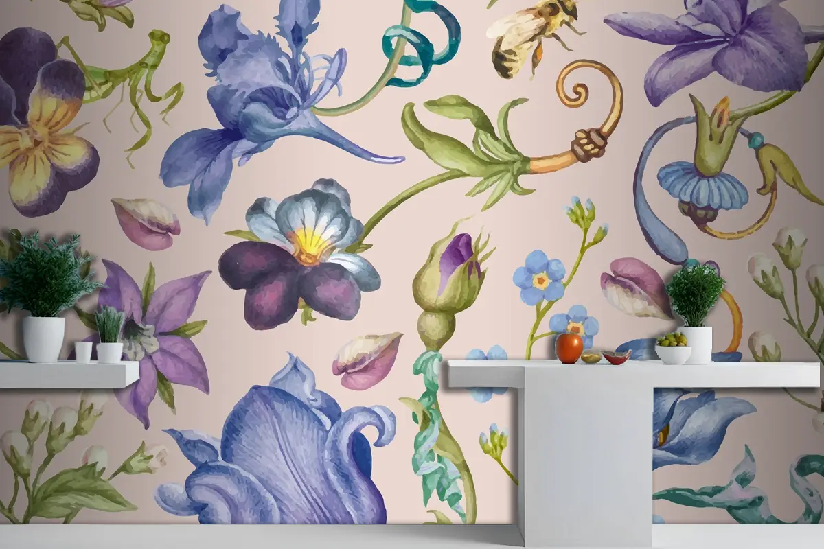 Pembe Arka Planda Estetik Mor Çiçek Desenli Mutfak Duvar Kağıdı