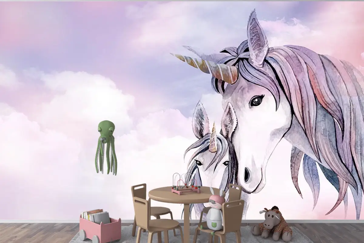 Pembe Bulutlar Üzerinde Unicorn Çocuk Odası Duvar Kağıdı